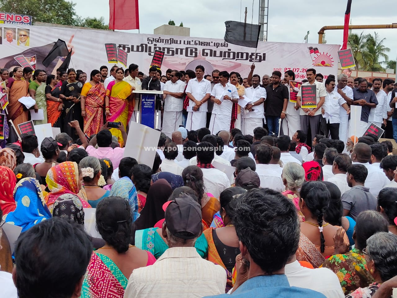 திருவள்ளூர்: பாராளுமன்றத்தில் ஒன்றிய அரசு சார்பில் தாக்கல் செய்யப்பட்ட நிதிநிலை அறிக்கையில் தமிழ்நாடு புறக்கணிக்கப்பட்டதை கண்டித்து திமுக சார்பில் இன்று மாநிலம் தழுவிய ஆர்ப்பாட்டம் நடைபெறும் என அக்கட்சித் தலைமை அறிவித்தது. இதன் ஒரு பகுதியாக திருவள்ளூர் மாவட்டம் பொன்னேரி அண்ணா சிலை அருகே திருவள்ளூர் கிழக்கு மாவட்ட திமுக செயலாளரும், கும்மிடிப்பூண்டி எம்எல்ஏவுமான டி.ஜே.கோவிந்தராஜன் தலைமையில் 1000க்கும் மேற்பட்டோர் கண்டன ஆர்ப்பாட்டத்தில் ஈடுபட்டனர். தமிழ்நாட்டு மக்களிடமிருந்து ஜிஎஸ்டி வரி வசூல் செய்யும் ஒன்றிய அரசு நிதிநிலை அறிக்கையில் தமிழ்நாட்டை புறக்கணிப்பதை கண்டித்து கண்டனம் முழக்கங்கள் எழுப்பப்பட்டன. தொடர்ந்து தமிழ்நாட்டை ஒன்றிய அரசு மாற்றான் தாய் மனப்பான்மையோடு நடத்தி வருவதாக குற்றம் சாட்டினர். எதிர்க்கட்சிகள் ஆளும் மாநிலங்களுக்கு மக்கள் நல திட்டங்களுக்கான நிதியை ஒன்றிய அரசு ஒதுக்குவதில்லை எனவும் புகார் தெரிவித்தனர். பழிவாங்கும் எண்ணத்தை ஒன்றிய அரசு கைவிட்டு சாலை பணிகள், மெட்ரோ ரயில் திட்டம் போன்றவற்றுக்கான நிதியை முறையாக விடுவிக்க வேண்டும் எனவும் ஆர்ப்பாட்டத்தில் வலியுறுத்தப்பட்டது.
