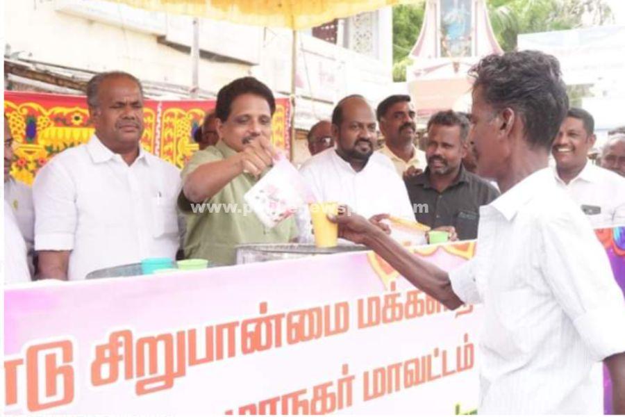 மதுரை : மதுரை அருள்மிகு மீனாட்சி சுந்தரேஸ்வரர் திருக்கல்யாண திருநாளை முன்னிட்டு தமிழ்நாடு சிறுபான்மை மக்கள் நலக்குழுவின் சார்பில் மதுரை பாராளுமன்ற உறுப்பினர் சு. வெங்கடேசன் தலைமையில் நீர்மோர் வழங்கும் நிகழ்வு மதுரையில் நடைபெற்றது.