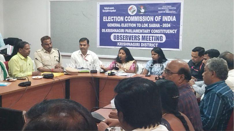 கிருஷ்ணகிரி: கிருஷ்ணகிரி பாராளுமன்ற தொகுதி தேர்தல் முன்னிட்டு மாவட்ட ஆட்சியர் சராயு IAS தலைமையில் நடைபெற்றது கிருஷ்ணகிரி மாவட்ட காவல் கண்காணிப்பாளர் திரு தங்கராஜ் மற்றும் தேர்தல் அலுவலர்கள் உடன் இருந்தனர் அருகில் வேட்பாளர் சந்திரமோகன் கலந்துகொண்டு தனது ஆலோசனைகளை வழங்கியும் தேர்தல் முடியும் வரை அரசு மதுபான கடைகளை இரவு 8 மணிக்குள் மூடப்பட வேண்டும் என்று கோரிக்கை முன் வைத்தார்.