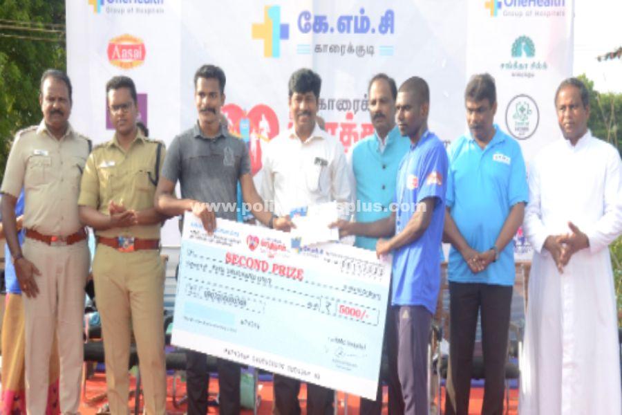 சிவகங்கை : உலக இருதய தினத்தை முன்னிட்டு காரைக்குடி கே.எம்.சி மருத்துவமனை சார்பாக மிக பிரமாண்ட மினி மாரத்தான் போட்டி ஏற்பாடு செய்யப்பட்டது. இம்மாரத்தான் போட்டியில் ஆண்களுக்கு (16) வயது முதல் (25) வயதினரும் (26) முதல் (49) வயது வரையும் 50 வயதினருக்கு மேல் என மூன்று பிரிவுகளும் பெண்களுக்கான பிரிவில் (16) வயதிற்கு மேற்பட்ட பெண்கள் கலந்து கொண்டனர்.பிரிவினருக்கான மாரத்தானை அருள் தந்தை ஜான் வசந்த குமார் இமுதல்வர் ஆனந்தா கல்லூரி தேவகோட்டை அவர்களும் (50) வயதுக்கு மேற்பட்டோர் பிரிவினருக்கான மாரத்தானை திரு. அப்துல் ரஹுமான் ஐக்கிய கூட்டமைப்பு ஜமாஅத் தலைவர் அவர்களும் பெண்களுக்கான பிரிவை முனைவர் பெத்தாலெட்சுமி, முதல்வர், அழகப்பா அரசு கலை கல்லூரி அவர்களும் கொடியசைத்து துவங்கி வைத்தனர். சிறப்பு விருந்தினராக காரைக்குடி உதவி காவல் கண்காணிப்பாளர் திரு.ஸ்டாலின், அவர்களும் பங்கேற்று வெற்றிகரமாக இலக்கை அடைந்தது இளைஞர்களுக்கு உற்சாகத்தை அளித்தது. இருதய பாதுகாப்பை வலியுறுத்தி நடத்தப்பட்ட இந்த மாரத்தான் போட்டியில் சுமார் 2000க்கும் மேற்பட்ட வீரர் வீராங்கனைகள் பங்கேற்று வெற்றியிலக்கினை முதல் (25) வயதினருக்கான அடைந்தனர். இதில் (16) வயது ஆண்களுக்கான பிரிவில் திரு. வேல்முருகன் முதலிடத்தையும் திரு. பிரகாஷ் இரண்டாமிடத்தையும் திரு. சுகுமார் மூன்றாவது இடத்தையும் பிடித்தனர். 26 வயது முதல் 49 வயதினருக்கான ஆண்களுக்கான பிரிவில் திரு. விக்டர் என்பவர் மூன்றாமிடத்தையும் 50 வயதிற்கு மேற்பட்டவர்களுக்கான பிரிவில் திரு. நஞ்சுவாணன், திரு.தண்டாயுதபாணி, முதலிடத்தையும் இரண்டாமிடத்தையும் திரு. முருகன், மூன்றாமிடத்தையும் பெற்றனர்.