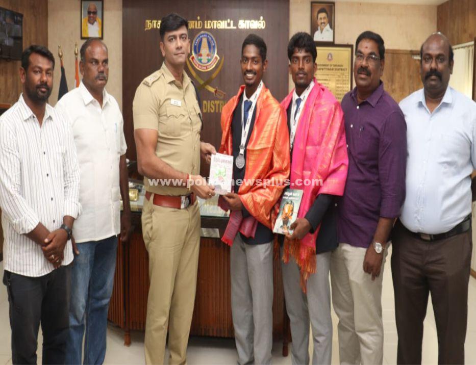 இந்திய அணி சார்பில் நாகை நம்பியார் நகரை சேர்ந்த அபிதன் மற்றும் தஞ்சை மாவட்டம் ஒரத்தநாடு அருகே நெடுவாகோட்டையை சேர்ந்த பூந்தமிழன் ஆகியோர் கலந்து கொண்டு விளையாடினர். மேலும் இறுதி போட்டியில் இந்திய – ரஷ்ய அணிகள் மோதியதில் இந்திய அணி 2-ம் இடமான வெள்ளிப் பதக்கத்தை பெற்றது. சர்வதேச போட்டியில் வெள்ளிப் பதக்கம் வென்று தாய்நாட்டுக்கு பெருமை சேர்த்த அபிதன், பூந்தமிழன் ஆகியோருக்கு பாராட்டுக்கள் குவிந்து வருகிறது. இந்த நிலையில் இந்திய பீச் வாலிபால் அணியினர் நேற்று சொந்த ஊர் திரும்பினர். இதனை தொடர்ந்து (25.10.2023) நாகப்பட்டினம் மாவட்ட காவல் கண்காணிப்பாளர் திரு ஹர்ஷ் சிங் இ. கா. ப அவர்கள், விளையாட்டு வீரர்களை கௌரவிக்கும் வகையில் நேரில் அழைத்து சால்வை அணிவித்து புத்தகங்கள் வழங்கி பாராட்டியதுடன் நம் இந்திய நாட்டிற்கு மேன்மேலும் பெருமை சேர்க்கும் வகையில் செயல்பட வேண்டுமென அறிவுரை கூறினார்கள்.