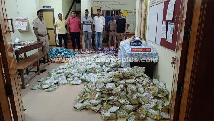 ராமநாதபுரம் : ராமநாதபுரம் மாவட்டம் திருவாடானை உட்கோட்டம் ஆர் .எஸ் மங்கலம் தாலுகா குள்ளமடை கிறிஸ்துவ ஆலயம் அருகில் ஆர். எஸ் மங்கலம் காவல் நிலைய ஆய்வாளர் பாஸ்கர் சார்பு ஆய்வாளர், விஷ்ணுவரதன் உள்ளிட்டவர் காவல் துறையினர் உள்ளிட்டவர்கள் ரோந்துப் பணியில் ஈடுபட்டபோது காலை 5 மணி அளவில் சந்தேகத்துக்கு இடமான முறையில் வந்த வேனை நிறுத்தி சோதனை செய்தனர். அந்த வேனில் தடை செய்யப்பட்ட 250 கிலோ புகையிலை பொருட்கள் இருந்ததை கைப்பற்றி அதை கடத்தி வந்த R.S மங்கலம், கோழியார்கோட்டை, மாரிகிருஷ்ணன் மகன் சித்திரவேல், மற்றும் R.S மங்கலம் புல்லமடை மேற்கு தெரு,சுப்பையா மகன் ராஜ்குமார் இருவரையும் கைது செய்ய போலிசார் விசாரித்து வருகின்றனர்.
