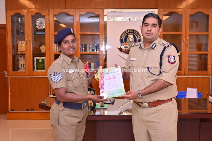 திருநெல்வேலி : திருநெல்வேலி மாநகரம் பெருமாள்புரம் காவல் நிலையத்தில் பெண் தலைமை காவலராக பணியாற்றி வரும் கற்பக ராஜலட்சுமி ஈரோடு மாவட்டம், வ.உ.சி விளையாட்டு அரங்கத்தில் நடைபெற்ற 39- வது மூத்தோர் தடகள போட்டிகள்- 2024 விளையாட்டு போட்டிகளில் பங்கு பெற்று “வட்டு எறிதல் போட்டியில் இரண்டாம் இடத்தையும், 400 மீட்டர் ஓட்டப்பந்தயத்தில் மூன்றாம் இடத்தையும், மற்றும் குண்டு எறிதல் போட்டியில் மூன்றாம் இடத்தையும் பெற்றுள்ளார். போட்டிகளில் வென்ற தலைமைப் பெண் காவலரை (31-12-2024) ம் தேதியன்று, திருநெல்வேலி மாநகர காவல் ஆணையர் ரூபேஷ் குமார் மீனா, இ.கா.ப., நேரில் அழைத்து பாராட்டு தெரிவித்தார்.