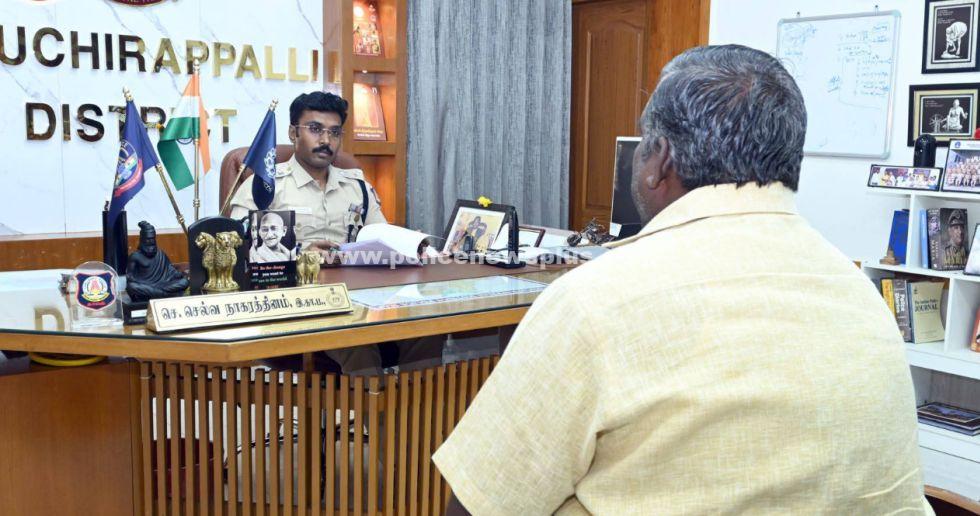 திருச்சி: வாராந்திர பொதுமக்கள் குறைதீர்ப்பு கூட்டம் திருச்சி மாவட்ட காவல் கண்காணிப்பாளர் திரு.செ.செல்வநாகரத்தினம், இ.கா.ப., அவர்களின் தலைமையில் மாவட்ட காவல் அலுவலகத்தில் (03.09.2025) நடைபெற்றது. பொதுமக்கள் குறைதீர்ப்பு கூட்டத்திற்கு மனு கொடுக்க வந்திருந்த பொதுமக்களிடமிருந்து மனுக்களை மாவட்ட காவல் கண்காணிப்பாளர் அவர்கள் நேரடியாக பெற்று குறைகளை கேட்டறிந்தார். மேலும், பெறப்பட்ட மனுக்கள் மீது துரிதமாக விசாரணை மேற்கொண்டு உரிய நடவடிக்கை எடுக்க சம்பந்தப்பட்ட அதிகாரிகளுக்கு உத்தரவிட்டார்.