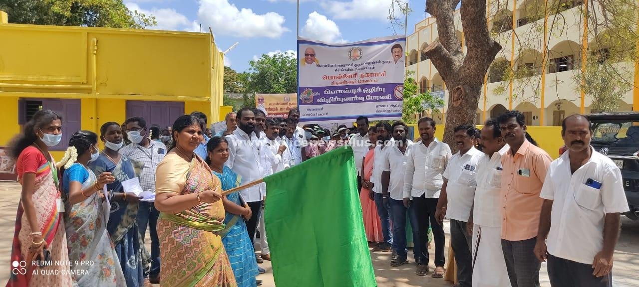 திருவள்ளூர் : பிளாஸ்டிக் பயன்பாட்டை தவிர்த்து துனிப்பை பயனபடுத்த தமிழக அரசு பல்வேறு நடவடிக்கைகளை மேற்கொண்டு வருகிறது. இதன் ஒரு பகுதியாக பொன்னேரி நகராட்சி சார்பில் பிலாஸ்டிக் பொருட்களின் பயன்பாட்டை தவிர்ப்பதன் அவசியத்தை வலியுறுத்தி விழிப்புணர்வு பேரணி நடைபெற்றது. அரசுப் பள்ளி மாணவர்கள் 100க்கும் மேற்பட்டோர் கலந்து கொண்ட இந்த பேரணியை நகர்மன்றத் தலைவர் பரிமளம் விஸ்வநாதன் கொடியசைத்து தொடங்கி வைத்தார். ஒருமுறை மட்டும் பயன்படுத்தப்படும் மக்காத பிளாஸ்டிக் பொருட்களால் ஏற்படும் பாதிப்புகள் குறித்து பதாகைகளை ஏந்தியபடி மாணவர்கள் விழிப்புணர்வு பேரணி சென்றனர்.