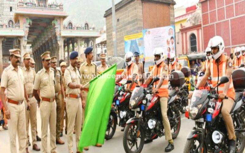 திருவண்ணாமலை : திருவண்ணாமலை நகரத்தில் கோவிலுக்கு வரும் பக்தர்களின் எண்ணிக்கை அதிகரித்துள்ளதால் மற்றும் குற்ற சம்பவங்களை தடுக்கும் பொருட்டு திருவண்ணாமலை நகரம் மற்றும் நகரத்தை சுற்றிலும் மக்களுடைய பாதுகாப்பிற்காக காவலர்களை அதிக அளவில் பணியில் ஈடுபடுத்தும் நோக்கத்தில் (24.04.2023) திருவண்ணாமலை மாவட்ட காவல் கண்காணிப்பாளர் மரு.கி.கார்த்திகேயன்,இ.கா.ப., அவர்கள் 12 இருசக்கர ரோந்து வாகனங்களை கொடியசைத்து துவக்கி வைத்தார்.