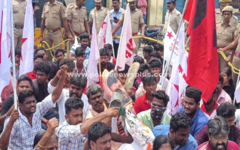 கப்பட்டிருந்தது. அதன்படி , ரெயில் நிலையம் முன்பு பெண்கள் உள்பட 150-க்கும் மேற்பட்டோர் திரண்டனர். அவர்கள் ,பாலியல் புகார் கூறப்பட்ட பிரிஜ் பூஷன் சரண் சிங் எம்.பி. மீது நடவடிக்கை எடுக்க வலியுறுத்தி கோஷமிட்டனர். தொடர்ந்து, அவரது உருவ பொம்மைக்கு செருப்பு மாலை அணிவிக்க முயன்றனர். உடனே ,அங்கிருந்த போலீசார் அவர்களை தடுத்தனர். இதைத் தொடர்ந்து, போராட்டகாரர்கள் ரெயில் நிலையத்திற்குள் நுழைய முயன்றனர். அப்போது ,போலீசார் அவர்களை தடுத்து நிறுத்தி ரெயில் மறியல் போராட்டம் நடத்த அனுமதியில்லை. எனவே, கலைந்து செல்லுங்கள் என எச்சரித்தனர். ஆனால், போராட்டக்காரர்கள் அங்கிருந்து செல்லாமல் ரெயில் நிலைய நுழைவு வாயில் முன்பு அமர்ந்து போராட்டத்தில் ஈடுபட்டனர். இதையடுத்து, போராட்டம் நடத்திய மாதர் சங்க நிர்வாகி பொன்னுத் தாய், சசிகலா, இந்திய வாலிபர் சங்க நிர்வாகி கருப்புசாமி, மாணவர் சங்க செயலாளர் பாலா உள்பட 150 பேரை கைது செய்தனர். இதனால், அங்கு பரபரப்பு ஏற்பட்டது.