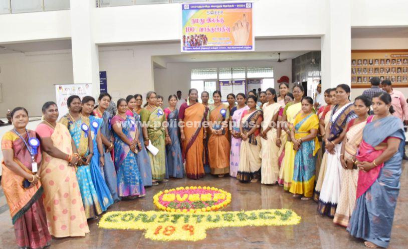 குறிப்பாக, வாக்காளர் விழிப்புணர்வு பேரணி , பொதுமக்கள் அதிகளவில் கூடும் இடங்களில் ”செல்ஃபி போட்டோ பாயிண்ட்” மாரத்தான் போட்டி, கையெழுத்து இயக்கம் என பல்வேறு விழிப்புணர்வு பணிகள் மேற்கொள்ளப்பட்டு வருகின்றன. அந்த வகையில், மதுரை மாவட்ட ஆட்சியர் அலுவலகத்தில் வருவாய் மற்றும் பேரிடர் மேலாண்மைத் துறையில் பணியாற்றும் பெண் பணியாளர்கள் ஒருங்கிணைப்பில் சர்வதேச மகளிர் தின விழா கொண்டாடப்பட்டது. இதன் ஒரு பகுதியாக , மாவட்ட தேர்தல் அலுவலர் மதுரை மாவட்ட ஆட்சித் தலைவர் மா.சௌ.சங்கீதா, தலைமையில் 100 சதவீதம் தேர்தல் வாக்குப்பதிவை வலியுறுத்தி, வாக்காளர் விழிப்புணர்வு பணி மேற்கொள்ளப்பட்டது. குறிப்பாக, மாவட்ட ஆட்சியர் அலுவலக கூடுதல் கட்டடத்தின் நுழைவு வாயிலில் ” இடம்பெற்ற கண்கவர் வண்ணக் கோலம் அமைக்கப்பட்டது. மேலும், ” 100 வாக்களிப்போம்” என மலர்களால் அலங்கரிக்கப்பட்டு மலர் கோலம் அமைக்கப்பட்டது. தொடர்ந்து, மாவட்ட தேர்தல் அலுவலர் மதுரை மாவட்ட ஆட்சித் தலைவர் தலைமையில் பெண் பணியாளர்கள், 100 தேர்தல் வாக்குப்பதிவை வலியுறுத்தி ‘கும்மி ஆட்டம்’ மூலம் வாக்காளர் விழிப்புணர்வு பணி மேற்கொண்டனர். இந்த நிகழ்வின் போது, மதுரை வருவாய் கோட்டாட்சியர் உதவி தேர்தல் நடத்தும் அலுவலர் ர.த.சாலினி