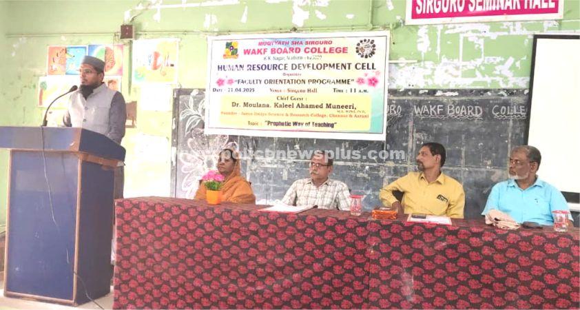 மதுரை : மதுரை வக்பு வாரிய கல்லூரியில், கல்லூரியின் மனிதவள மேம்பாட்டு கழகத்தின் சார்பாக கல்லூரி ஆசிரியர்களுக்கான நோக்குநிலைத் திட்டம் குறித்த கருத்தரங்கம் சர்குரோ அரங்கில் நடைபெற்றது. இதில், கல்லூரியின் முதல்வர் (பொறுப்பு) முனைவர் ஷாசுலி இப்ராஹிம் தலைமை தாங்கினார். மேலும், இக்கருத்தரங்கின் வரவேற்புரையை கல்லூரியின் மனித வள மேம்பாட்டு கழகத்தின் ஒருங்கிணைப்பாளர் முனைவர் மும்தாஜ் ஆற்றினார். இக்கருத்தரங்கிற்கு, ஜாமியா இல்மியா அறிவியல் மற்றும் ஆராய்ச்சி கல்லூரி, சென்னை மற்றும் ஆரணியை சார்ந்த மௌலானா கலீல் அஹமத் முனீரி அவர்கள் சிறப்பு விருந்தினராக கலந்து கொண்டு “தெய்வீக வழியில் போதிப்பது “என்ற தலைப்பில் சிறப்புரை ஆற்றினார்.