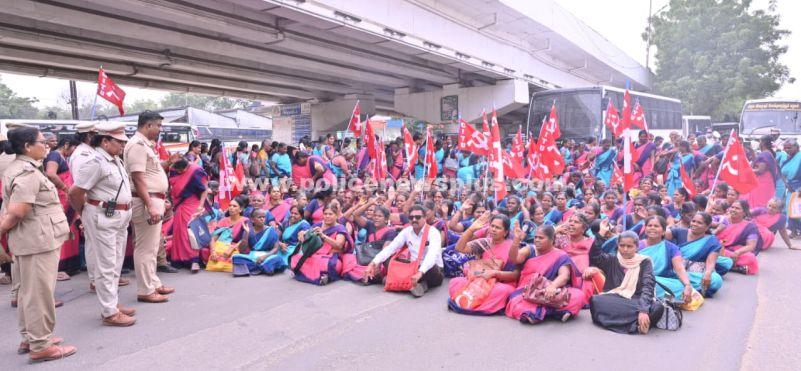 திருநெல்வேலி: திருநெல்வேலி வண்ணார்பேட்டை செல்லபாண்டியன் சிலை அருகே (06.01.2026) அன்று காலை சிஐடியு அங்கன்வாடி ஊழியர்கள் மற்றும் உதவியாளர் சங்கம் சார்பில் தேர்தல் வாக்குறுதி 313 ஐ நிறைவேற்றாத தமிழக அரசை கண்டித்து சாலை மறியல் போராட்டத்தில் ஈடுபட்ட 401 (ஒரு ஆண் உட்பட) நபர்கள் பாளையங்கோட்டை காவல்துறையினரால் கைது செய்யப்பட்டு கொக்கிரகுளம், ரோஸ் மஹாலில் வைக்கப்பட்டனர்.