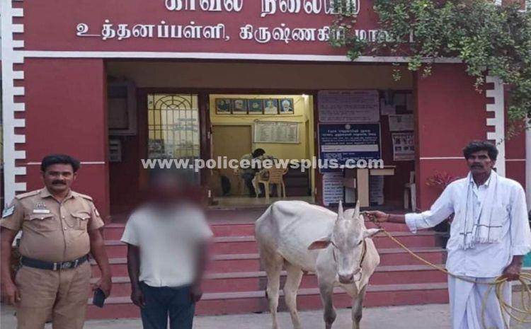 கிருஷ்ணகிரி: கிருஷ்ணகிரி மாவட்டம் உத்தனப்பள்ளி காவல் நிலைய எல்லைக்குட்பட்ட கனுஞ்சூர் கிராமத்தில் கோபால் என்பவர் குடியிருந்து கொண்டு விவசாயம் செய்து மாடு மேய்த்து வருவதாகவும் (27.11.2024) ஆம் தேதி மாலை 6.00 மணிக்கு மாட்டை மாட்டு கொட்டாயில் கட்டி வைத்துவிட்டு (28.11.2024) ஆம் தேதி விடியற்காலை சுமார் 04.00 மணிக்கு மாட்டு கொட்டாய்க்கு சென்று மாட்டை பார்த்த போது மாடு காணவில்லை என அக்கம் பக்கம் இருந்தவர்களிடம் விசாரித்து தகவல் தெரிந்தால் தெரிவிக்கும்படி சொல்லிவிட்டு தேடிக் கொண்டிருந்தபோது வாதியின் நண்பர் மாட்டை ஒரு நபர் பிடித்து செல்வதாக சொன்ன தகவலின் பேரில் சென்று மாடு திருடி சென்ற நபரை பிடித்து வைத்து உத்தனப்பள்ளி காவல் நிலையத்திற்கு தகவல் தெரிவிக்க போலீசார் சம்பவ இடத்திற்கு வந்து மாடு திருடிய நபரை கைது செய்து காவல் நிலையம் அழைத்துச் சென்றனர். கோபால் காவல் நிலையத்தில் ஆஜராகி கொடுத்த புகாரின் பேரில் வழக்கு பதிந்து போலீசார் மாடி திருடிய நபரை நீதிமன்றத்தில் ஆஜர்படுத்தி சிறையில் அடைத்தனர்.