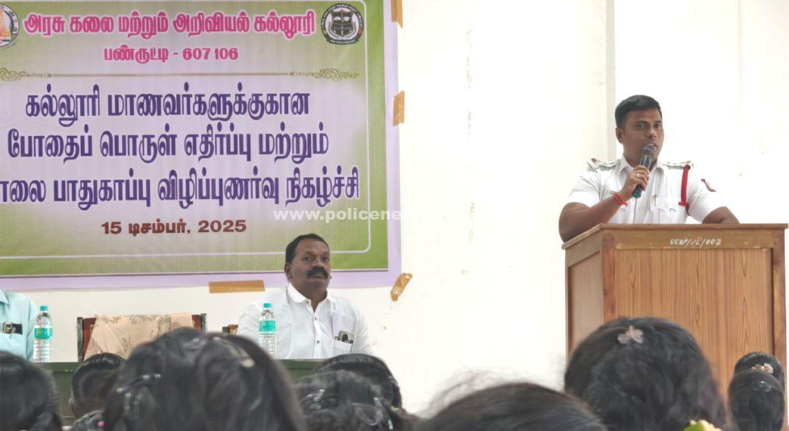 கடலூர் : கடலூர் மாவட்ட காவல் கண்காணிப்பாளர் அவர்கள் உத்தரவின் பேரில் பண்ருட்டி போக்குவரத்து காவல் ஆய்வாளர் திரு. பரமேஸ்வர பத்மநாபன் அவர்கள் பண்ருட்டி அரசு கலை மற்றும் அறிவியல் கல்லூரியில் மாணவ மாணவிகளுக்கு போதை பொருள் எதிர்ப்பு மற்றும் சாலை பாதுகாப்பு பற்றிய விழிப்புணர்வு ஏற்படுத்தினார்
