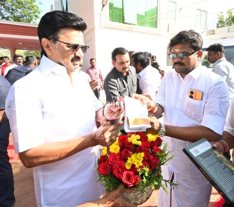 சிவகங்கை: தமிழ்நாட்டின் முதலமைச்சர் மாண்புமிகு முத்துவேல் கருணாநிதி ஸ்டாலின் அவர்கள் தமிழ்நாடு முழுவதும் நலத்திட்டங்கள் மற்றும் வளர்ச்சித் திட்டங்கள் பொதுமக்களுக்கு சென்றடையும் வகையில் சுற்றுப்பயணம் மேற்கொண்டார். அதன் அடிப்படையில் சிவகங்கை மாவட்டத்தின் மண்ணின் மைந்தன் மாண்புமிகு தமிழ்நாட்டின் கூட்டுறவுத்துறை அமைச்சர் மரியாதைக்குரிய கே ஆர் பெரிய கருப்பன் அவர்கள் மற்றும் முன்னாள் அமைச்சரும் கழக இலக்கிய அணி தலைவருமான மரியாதைக்குரிய மு தென்னவன் அவர்களுடன் சேர்ந்து, திராவிட முன்னேற்றக் கழகத்தின் சிவகங்கை மாவட்ட சுற்றுச்சூழல் துணை அமைப்பாளர் மாவட்டத்தின் மண்ணின் மைந்தன் சாய் சுரேஷ் என்ற ராமநாதன் அவர்கள் தமிழ்நாட்டின் முதலமைச்சர் மாண்புமிகு முத்துவேல் கருணாநிதி ஸ்டாலின் அவர்களை மகிழ்ச்சியுடன் வரவேற்றார்கள். இதற்கு சிவகங்கை மாவட்ட காவல்துறையினர் சிறப்பாக பாதுகாப்பு அளித்து இருந்தனர்.