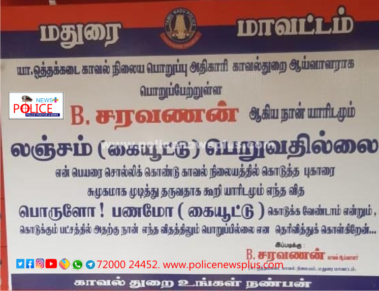 மதுரை: மதுரை மாவட்டம் ஒத்தக்கடை காவல் நிலைய காவல் ஆய்வாளராக பொறுப்பேற்ற திரு.சரவணன் அவர்கள் காவல் நிலைய வாசலில் நான் லஞ்சம் பெற மாட்டேன்,