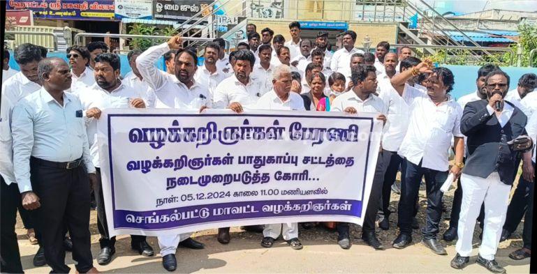 லாக்கப்பில் போட்டு கொன்று விடுவேன் என்று மிரட்டியும் காவல் நிலையத்தில் இருந்த காவலர்கள் எல்லாம் சேர்ந்து கொண்டு அவதூறாக பேசியும் தனக்கு ஏற்பட்ட காயத்திற்காக செங்கல்பட்டு அரசு மருத்துவமனையில் மூன்று நாட்களாக உள் நோயாளியாக சேர்ந்து சிகிச்சை பெற்று வந்த வழக்கறிஞர் ஜெகதீசன் அவர்களுக்கு நியாயம் வழங்க கோரியும் வழக்கறிஞரை தாக்கிய மறைமலைநகர் குற்ற பிரிவு காவல் ஆய்வாளர் கிருஷ்ணகுமார் மீது வழக்கு பதிவு செய்து கைது செய்ய வலியுறுத்தியும், 2016 ஆம் ஆண்டு கோயம்பேடு காவல் நிலையத்தில் பணியிலிருந்த போது இதே கிருஷ்ணகுமார் அவர்களால் தாக்குதலுக்குள்ளானஹேமராஜ் என்ற வழக்கறிஞருக்கும் நியாயம் வழங்க கோரியும் மற்றும் தமிழக அளவில் நீதிமன்ற நுழைவாயில் முன்பாகவும் பணியிடங்களிலும் காவல் நிலையங்களிலும் சமூக விரோதிகளாலும் தொடர்ந்து வழக்கறிஞர்கள் பாதிக்கப்படுவதால் உடனடியாக வழக்கறிஞர்கள் பாதுகாப்பு சட்ட மசோதாவை நிறைவேற்ற வலியுறுத்தி கண்டன கோஷங்கள் எழுப்பப்பட்டன.