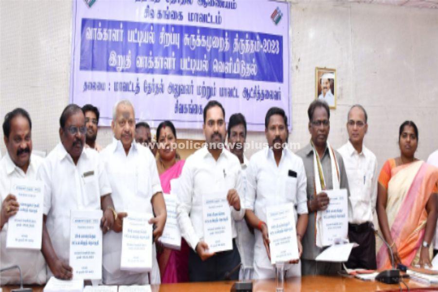 சிவகங்கை மாவட்ட ஆட்சியர் அலுவலகக் கூட்டரங்கில் , இந்திய தேர்தல் ஆணையம் அறிவுரைப்படி (01.01.2023), -ஐ தகுதிநாளாகக் கொண்டு தயாரிக்கப்பட்ட வாக்காளர் பட்டியல் சிறப்பு சுருக்கமுறைத் திருத்தம் இறுதி வாக்காளர் பட்டியலினை அங்கீகரிக்கப்பட்ட அனைத்துக்கட்சி பிரமுகர்கள் முன்னிலையில் மாவட்ட ஆட்சித்தலைவர் ப.மதுசூதன் ரெட்டி, வெளியிட்டு தெரிவிக்கையில், இந்திய தேர்தல் ஆணையம் அறிவுரைப்படி ஒவ்வொரு ஆண்டும் வாக்காளர் பெயர் சேர்த்தல்இ நீக்கல் திருத்தம் மற்றும் வாக்குச்சாவடி மையம் விரிவுபடுத்துதல் தொடர்பாக பணிகள் மேற்கொள்ளப்பட்டு அங்கீகரிக்கப்பட்ட அனைத்துக்கட்சி பிரமுகர்களின் ஆலோசனை மற்றும் பொதுமக்களின் ஆலோசனை பெற்று அதனடிப்படையில் இந்திய தேர்தல் ஆணையம் வழிகாட்டுதலின்படி திட்டப்பணிகள் மேற்கொள்ளப்பட்டு வருகின்றன.