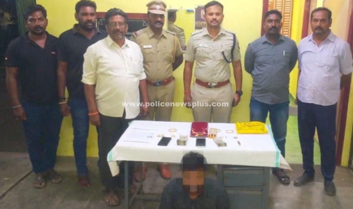 சமயநல்லூர் உட்கோட்டம் சமயநல்லூர் காவல் நிலைய எல்லைக்குட்பட்ட பரவை அவுலி அம்மன் கோவில் அருகே வசிக்கும் கோவிந்தராஜுலு என்பவர் குடும்பத்துடன் வெளியூர் சென்று திரும்பி வந்த நிலையில், வீட்டில் இருந்த நகைகள் காணவில்லை என்று சமயநல்லூர் காவல் நிலையத்தில் கொடுத்த புகாரின் அடிப்படையில் சமயநல்லூர் போலீசார் விசாரணை மேற்கொண்டு, வடுகபட்டியை சேர்ந்த கார்த்திக் கண்ணன் (33). என்பவரை கைது செய்து, சுமார் 30 பவுன் நகைகளை அவரிடமிருந்து மீட்டு, குற்றவாளியை நீதிமன்ற காவலுக்கு உட்படுத்தினர்.