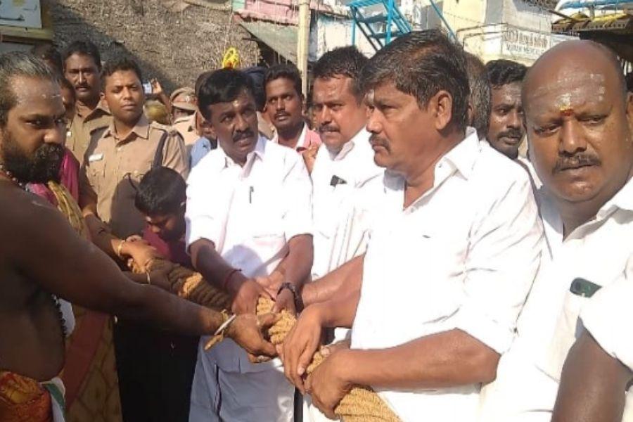 மதுரை : மதுரை மாவட்டம், சோழவந்தான் ஜெனகை மாரியம்மன் கோவில் மிகவும் பிரசித்தி பெற்றது. கடந்த மே 22, தேதி திருவிழா கொடியேற்றம் நடைபெற்று தினசரி வெவ்வேறு வாகனத்தில் அம்மன் வீதியுலா நடந்து தினசரி கலைநிகழ்ச்சி நடந்தது. நேற்று 16ஆம் நாள் திருவிழா தேரோட்டம் திருவிழா நடந்தது. இவ்விழாவை முன்னிட்டு அதிகாலை அம்மன் கேடயத்தில் அலங்காரமாகி கோவிலில் இருந்து புறப்பட்டு தேருக்கு வந்து சேர்ந்தது.அர்ச்சகர் சண்முகவேல் பூஜைகள் செய்தார். வெங்கடேசன் எம்,எல்,ஏ,மாவட்ட காவல்துறை கண்காணிப்பாளர் சிவபிரசாத், டி.எஸ்.பி பாலசுந்தரம், தாசில்தார் மூர்த்தி, இன்ஸ்பெக்டர் சிவபாலன், பேரூராட்சித் தலைவர் ஜெயராமன், ஜெனகை டிரஸ்ட் தலைவர் செல்வம், பேரூராட்சி செயல் அலுவலர் சகாய அந்தோணி யூசின் , கோவில் செயல்அலுவலர் இளமதி மற்றும் பக்தர்கள் ஆகியோர் திருத்தேரை வடம் பிடித்து இழுத்தனர்.சோழவந்தான் பாட்டியமந்தார்,கிராம காவல்காரர்கள் ஆகியோர் தேரை வடம்பிடித்து இழுப்பதற்கு வெள்ளை வீசினார்கள். தேர் அங்கிருந்து புறப்பட்டு கடைவீதி,தெற்குரதவீதி, மேலரதவீதி,வடக்குரதவீதி, வழியாக தேர் வலம் வந்து புறப்பட்ட இடத்திற்கு தேர் வந்து சேர்ந்தது. தேர் வலம் வருவதற்கு ஆசாரியர்கள் தேர் சக்கரங்களை முறையாக குடில் கட்டை போட்டு வழிநடத்தி வந்தனர்.வழிநெடுக அம்மனை வரவேற்றுபூஜைகள் செய்தனர். சோழவந்தான் அரிமா சங்கத் தலைவர் டாக்டர். மருது பாண்டியன்முன்னாள் சேர்மன் எம்.கே, முருகேசன் திரௌபதி அம்மன் கோவில் பரம்பரை அறங்காவலர் ஜவஹர்லால் தி.மு.க தொழில்நுட்ப அணி பார்த்திபன் இதில் வருவாய் ஆய்வாளர் சுப்புலட்சுமி, சுகாதாரபணிஆய்வாளர் முருகானந்தம்,துணைத்தலைவர் லதாகண்ணன், பணி நியமனக்குழு ஈஸ்வரி ஸ்டாலின் வார்டுகவுன்சிலர்கள் மருதுபாண்டியன், சத்யபிரகாஷ்,குருசாமிஉள்பட பலர் கலந்து கொண்டனர்.