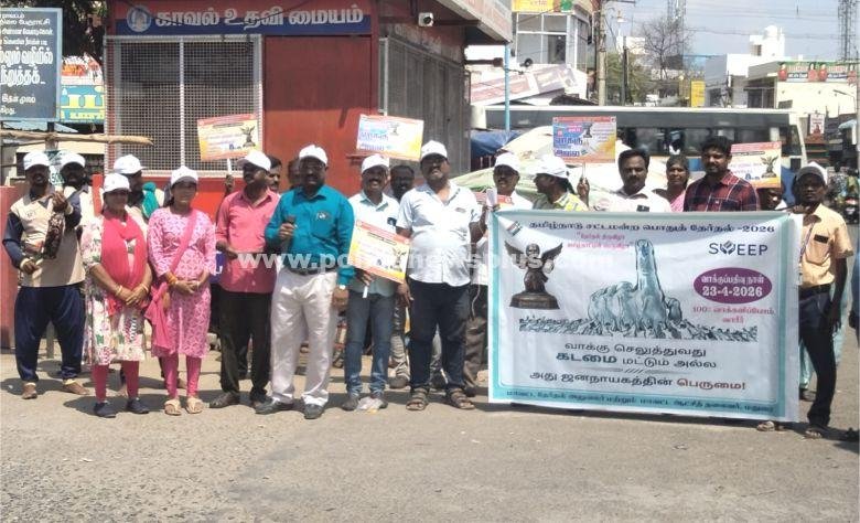 இதில் வாக்களிப்பது எங்கள் உரிமை வாக்களிப்பது எங்கள் கடமை எங்கள் வாக்கு விற்பனைக் கு அல்ல என்ற வாசகங்கள் எழுதிய பதாகைகளை ஏந்திய படி நின்றனர். இதில் மதுரை கலைகுழுவைச் சேர்ந்தவர்கள் தாரை தப்பட்டை முழங்க வாக்களிக்க வேண்டியதன் அவசியத்தை வலியுறுத்தி விழிப்புணர்வு பாடல் பாடி நடனம் ஆடினர். இந்த கலை நிகழ்ச்சியை பஸ் பயணிகள் வியாபாரிகள் பொதுமக்கள் கண்டு களித்தனர்.