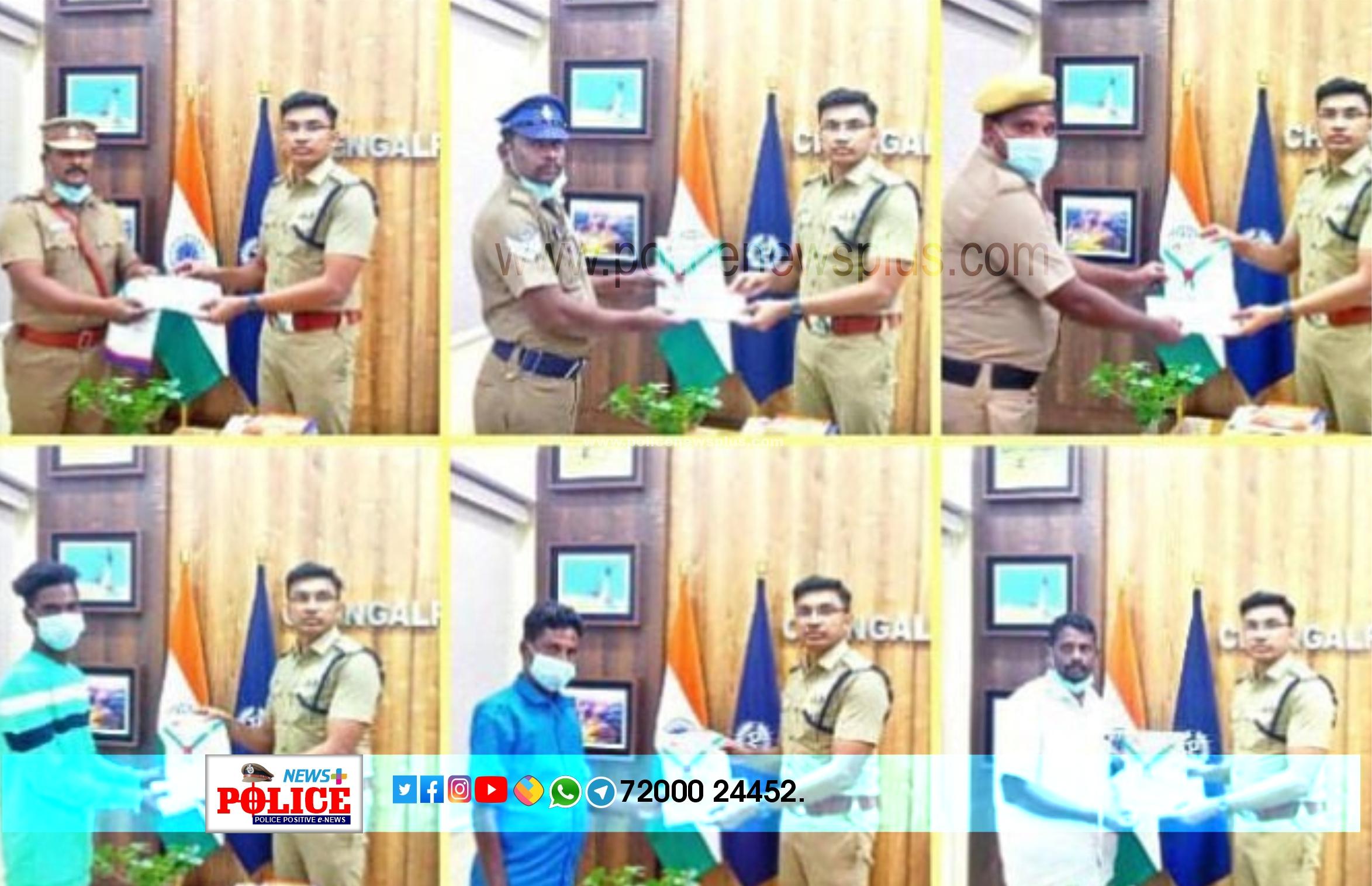 செங்கல்பட்டு : செங்கல்பட்டு மாவட்ட காவல் கண்காணிப்பாளர் திரு.P.அரவிந்தன் IPS அவர்கள் மாமல்லபுரம் காவல்நிலைய கொள்ளை சம்பவத்தில் ஈடுபட்ட 8 குற்றவாளிகளை துரிதமாக கைது செய்த காவல் உதவிஆய்வாளர் திரு.அசோக் சக்ரவர்த்தி, தலைமை காவலர் திரு.மணிகண்டன் HC 106, திரு.மணிகண்டன் HG 318 மற்றும் காவலர்களுக்கு உதவிய பொதுமக்கள் திரு.சத்யா, திரு.வாசுதேவன், திரு.அசோக்குமார் ஆகியோர்களை பாராட்டி சான்றிதழ் மற்றும் பணவெகுமதி அளித்தார்கள்.