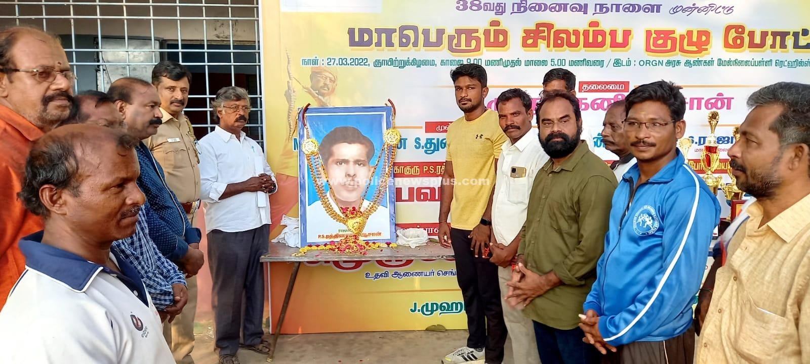 திருவள்ளூர் : சி.பா.ஆதித்தனார் சிலம்ப கலைக்கூட நிறுவனர். ராஜமகாகுரு. பி.எஸ்.ரத் தினசாமி ஆசான் 38 வது நினைவு நாளை முன்னிட்டு நடந்த திருவள்ளூர் மாவட்ட அளவிலான சிலம்ப குழு போட்டியில் ஆரம்பாக்கம் எம் ஜி ஆர் சிலம்ப கலைக்கூடம் முதலிடம் பெற்றது. மாவட்ட கல்வி அலுவலர் செல்வ கணேசன். உடற்கல்வி ஆய்வாளர்.நரசிம் மராவ். செங்குன்றம் இன்ஸ்பெக்டர்.ரமேஷ். திரைப்பட இயக்குனர்.ரத்னகுமார். ஆகியோர் வெற்றி கோப்பையை தலைமை ஆசான். எஸ். துரையிடம் வழங்கினர். ஆர். முருககனி. எம்.ராஜா. நடராஜன். எஸ். ராஜா. ஜெ.ரஜினி. எம். பாஸ்கர். ஜெ. முகமது அப்துல் காதர் உட்பட பலர் உள்ளனர்.