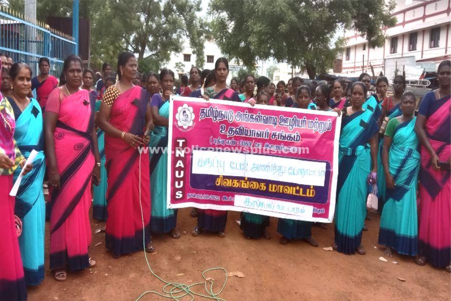 கோரிக்கைகள் ஐந்து ஆண்டுகள் பணி முடித்த மினி அங்கன்வாடி ஊழியர்களுக்கு பதவி உயர்வு ஒவ்வொரு ஆண்டும் ஜனவரி மாதம் வழங்க வேண்டும் என்று அரசாணை இருந்து இன்று வரை சிவகங்கை மாவட்டத்தில் பதவி உயர்வு வழங்கப்படவில்லை உடனடியாக பதவி உயர்வு வழங்கப்பட வேண்டும். காலி பணியிடங்களை உடனடியாக நிரப்ப வேண்டும்.3 பத்து குழந்தைகளுக்கு குறைவாக இருக்கின்ற மையங்களை மூடுகின்ற திட்டத்தை உடனடியாக கைவிட வேண்டும். குழந்தைகள் குறைவாக இருக்கின்ற மையங்களை அருகில் இருக்கும் மையங்களோடு இணைக்கின்ற திட்டத்தை கைவிட வேண்டும்.பத்தாண்டு பணி முடித்த அங்கன்வாடி உதவியாளர்களுக்கு அங்கன்வாடி பணியாளர்களாக பதவி உயர்வு உடனடியாக வழங்க வேண்டும். 6,19 93 ஆம் ஆண்டு பணியில் சேர்ந்த பணியாளர்களின் பதவி உயர்வு உடனடியாக வழங்க வேண்டும்.
