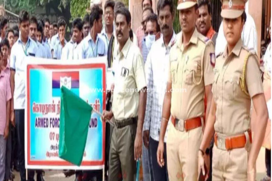 ராணிப்பேட்டை : ராணிப்பேட்டை முப்படை வீரர்கள், ஓய்வு பெற்ற முன்னாள் படை வீரர்களின் நலன்களை காக்கும் வகையில் கொடி நாள் நிதி வசூலிக்கப்பட்டு படை வீரர்கள் நல வாரியத்திடம் ஒப்படைக்கப்பட்டு வருகிறது. அதன்படி அரக்கோணத்தில் கொடி நாள் ஊர்வலம் நடைபெற்றது. அரக்கோணம் தாலுகா அலுவலகத்தில் இருந்து புறப்பட்டு பஜார் வரை பள்ளி கல்லூரி மாணவ, மாணவியர்கள் ஊர்வலமாக சென்றனர். ஊர்வலத்தை தாசில்தார் சண்முக சுந்தரம் கொடியசைத்து தொடங்கி வைத்தார். இந்த ஊர்வலத்தில் தலைமையிடத்து துணை தாசில்தார் சமரபுரி, தேர்தல் பிரிவு துணை தாசில்தார் சரஸ்வதி, வருவாய் ஆய்வாளர்கள் யுவராணி, குழந்தை தெரேசா, ஜெயபால், கிராம நிர்வாக அலுவலர்கள் ராஜேஷ், லட்சுமி நாராயணன், கலைவாணன், பவானி மற்றும் அலுவலர்கள் பலர் கலந்து கொண்டனர்.