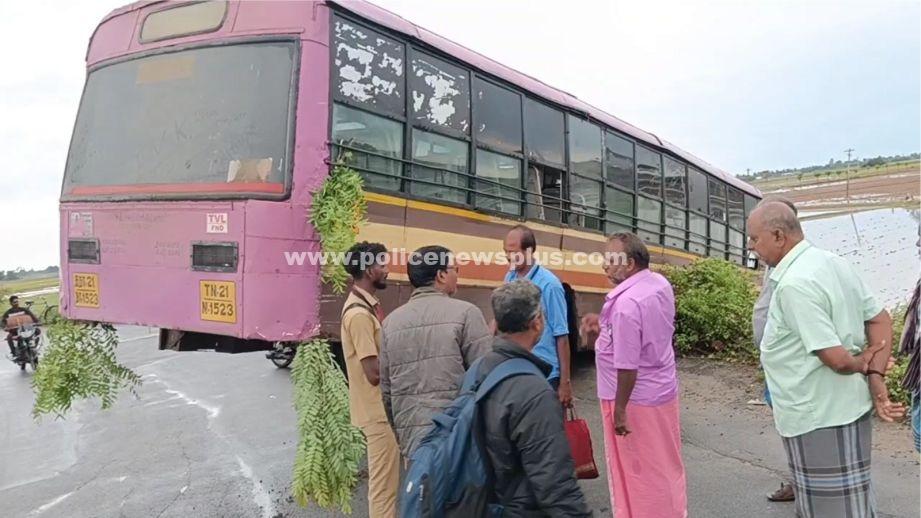 இதனால் பேருந்தில் இருந்த 8 பயணிகள், ஓட்டுநர், நடத்துனர் உள்ளிட்டோர் அலறி அடித்துக் கொண்டு பேருந்தில் இருந்து கீழே இறங்கினர். பேருந்து ஏரிக்கரை தடுப்புச் சுவற்றில் சிக்கி ஒரு சக்கரம் ஒருபுறம் வயல்வெளியில் மறுபுறம் சாலையிலும் என அந்தரத்தில் தொங்கிக் கொண்டிருப்பதால் பரபரப்பு நிலவி வருகிறது. தொடர்ந்து காவல்துறை மற்றும் போக்குவரத்து பணிமனை அதிகாரிகள் பேருந்தை மீட்பதற்கான நடவடிக்கைகளை மேற்கொண்டு வருகின்றனர். தொழில்நுட்ப கோளாறு காரணமாக பேருந்தின் முன் சக்கரம் பிரேக் பிடிக்காததால் விபத்து ஏற்பட்டது காவல்துறையின் முதற்கட்ட விசாரணையில் தெரிய வந்துள்ளது.