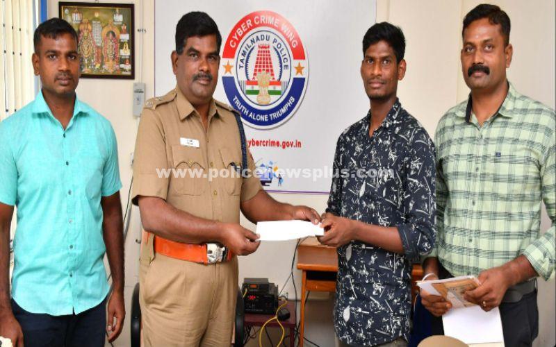 திருவண்ணாமலை: ஆன்லைன் மோசடி நபர்களால் பணத்தை இழந்தவருக்கு உரிய விசாரணை செய்து துரிதமாக செயல்பட்டு பணத்தை மீட்டு (24.07.2023) திருவண்ணாமலை மாவட்ட காவல் அலுவலகத்தில் மாவட்ட காவல் கண்காணிப்பாளர் மரு.கி.கார்த்திகேயன்,இ.கா.ப. அவர்கள், அறிவுறுத்தலின்படி சைபர் கிரைம் கூடுதல் காவல் கண்காணிப்பாளர் திரு.M.பழனி அவர்கள், உரியவரிடம் ஒப்படைத்தார். காவல் ஆய்வாளர் திரு.B.முருகானந்தம் அவர்கள் உடனிருந்தார்.