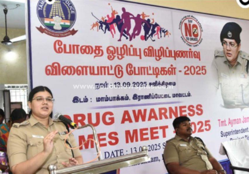 இராணிப்பேட்டை : இராணிப்பேட்டை மாவட்டம், வாழைப்பந்தல் அருகே உள்ள மாம்பாக்கம் அரசு மேல்நிலைப் பள்ளியில், போதை ஒழிப்பு விழிப்புணர்வு ஏற்படுத்தும் நோக்கில் காவல்துறை சார்பில் சிறப்பு நிகழ்ச்சி நடத்தப்பட்டது. இந்த நிகழ்ச்சியில், இராணிப்பேட்டை மாவட்ட காவல் கண்காணிப்பாளர் திருமதி.அய்மன் ஜமால், இ.கா.ப., அவர்கள் மாணவர்களுக்காக சிறப்பாக தயாரிக்கப்பட்ட டி-ஷர்ட்களை வழங்கி, பல்வேறு விளையாட்டுப் போட்டிகளைத் துவக்கி வைத்தார் முன்னதாக தனியார் மண்டபத்தில் நடைபெற்ற போதை விழிப்புணர்வு நிகழ்ச்சியில் போதையால் ஏற்படும் பாதிப்புகள் குறித்தான விழிப்புணர்வு குழு நாடகம் கவிதை பேச்சுப் போட்டிகள் உள்ளிட்டவை மாணவ/மாணவிகள் நடத்திக் காட்டினார்கள். மாவட்ட காவல் கண்காணிப்பாளர் அவர்கள்,“போதைப் பொருட்கள் சமுதாயத்தை சீர்கெடுக்கக்கூடியவை. இவற்றிலிருந்து விடுபட வேண்டும் என்பதற்காகவே இத்தகைய விழிப்புணர்வு நிகழ்ச்சிகள் மற்றும் விளையாட்டுப் போட்டிகள் காவல்துறை சார்பில் நடத்தப்படுகின்றன.