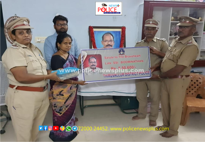 திருவள்ளூர்: கடந்த 21.11.2021 அன்று பணியிலிருக்கும்போது கொலை செய்யப்பட்ட திருச்சி மாவட்டம் நாவல்பட்டு காவல் நிலைய சிறப்பு உதவி ஆய்வாளர் திரு. பூமிநாதன் அவர்கள் குடும்பத்திற்கு திருவள்ளூர் மாவட்ட காவல் துறையினர் சார்பாக ரூபாய் 5,50,600/- ஐ, நேற்று 30.11.2021 அன்று இரவு பொன்னேரி அணைத்து மகளிர் காவல் ஆய்வாளர் திருமதி.மகிதா ஆணி கிறிஸ்டி அவர்கள் திருச்சியில் அவரது இல்லத்திற்கே நேரில் சென்று அன்னாரது மனைவி மற்றும் மகனிடம் வழங்கினார்.