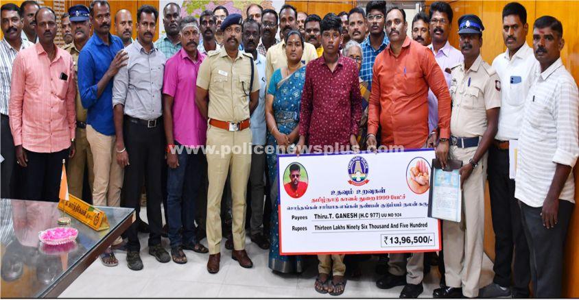 திருவண்ணாமலை : திருவண்ணாமலை மாவட்டத்தில் மங்கலம் காவல் நிலையத்தில் பணிபுரிந்து வந்த தலைமை காவலர் 977, தெய்வதிரு.T.கனேஷ் அவர்கள் உடல் நல குறைவால் (21.10.2023) அன்று இயற்கை எய்தினார், அவரது குடும்பத்திற்கு உதவும் வகையில் தமிழ்நாடு முழுவதும் உள்ள 1999 Batch காவலர்கள் இணைந்து ரூபாய் 13,96,500/- பணத்திற்கான காசோலையை அவர்கள் குடும்பத்தினருக்கு (16.12.2023) திருவண்ணாமலை மாவட்ட காவல் கண்காணிப்பாளர் மரு.கி.கார்த்திகேயன், இ.கா.ப., அவர்கள் முன்னிலையில் வழங்கப்பட்டது.