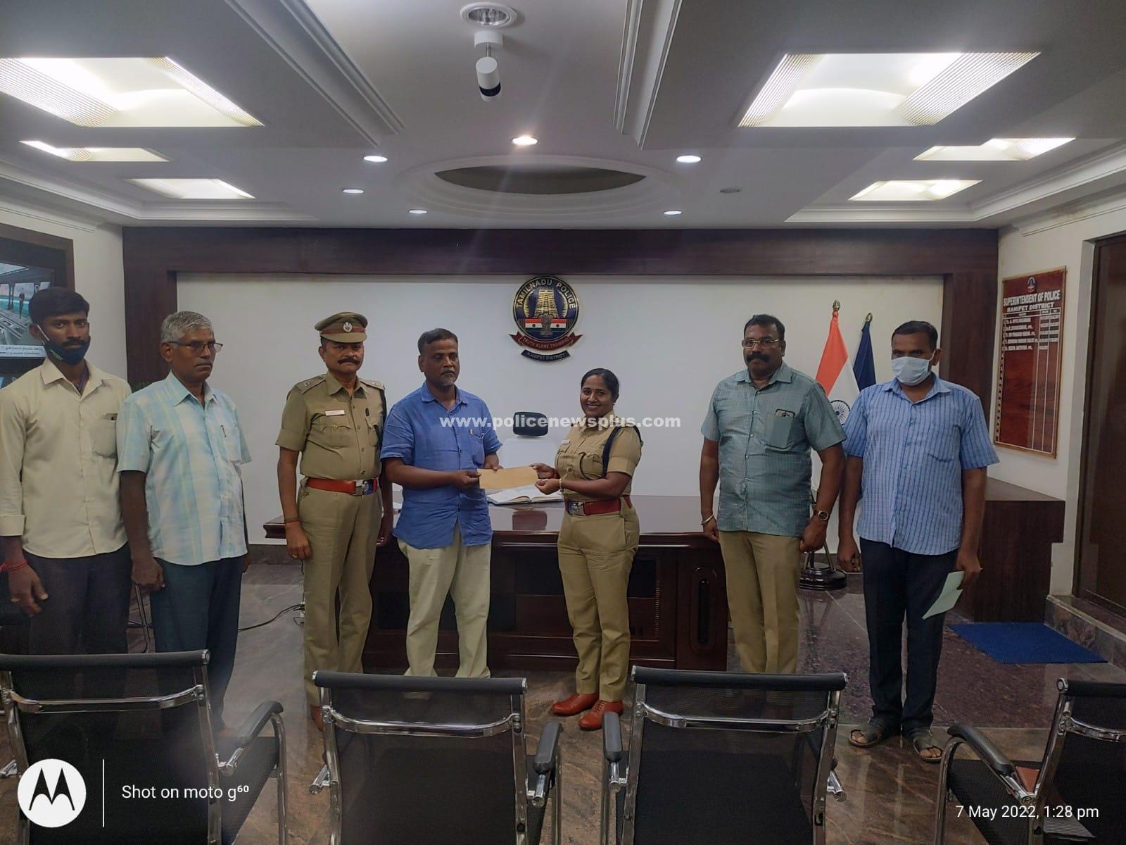 ராணிப்பேட்டை : ராணிப்பேட்டை மாவட்டத்தில், இயங்கி வரும் சைபர் கிரைம் காவல் நிலையத்தில், (07.05.2022) இன்று காலை, சுமார் 10.00 மணி அளவில் ராணிப்பேட்டையை, சேர்ந்த E.சார்லஸ், என்பவர் 40,000/- ரூபாய் பணத்தை இழந்ததாக, புகார் அளித்திருந்தார். காவல் கண்காணிப்பாளர் மருத்துவர் திருமதி. தீபா சத்யன், இ.கா.ப. அவர்களின் உத்தரவின் பேரில், கூடுதல் காவல் கண்காணிப்பாளர் திரு. P. முத்துக்கருப்பன், அவர்களின் தலைமையில் காவல் ஆய்வாளர் திரு. ராஜா குமார், அவர்களின் மேற்பார்வையில், சைபர் கிரைம் காவல் நிலையத்தில் துரிதமாக செயல்பட்டு, ஒரு மணி நேரத்திற்குள் பாதிக்கப்பட்ட, நபர் இழந்த பணத்தை, மீட்டு சம்பந்தப்பட்ட நபரிடம், காவல் கண்காணிப்பாளர் மருத்துவர் திருமதி. தீபா சத்யன், இ.ஆ.ப. அவர்கள் ஒப்படைத்தார்.