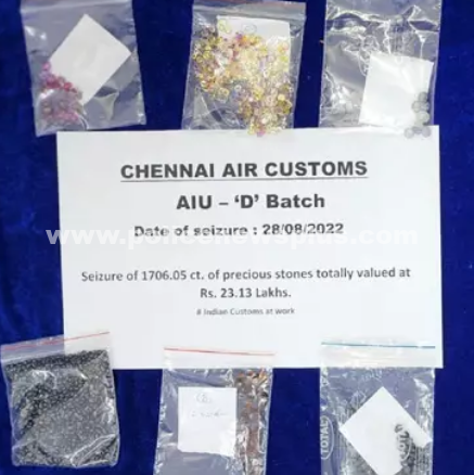 அப்போது உள்ளாடைக்குள் விலையுர்ந்த நவரத்தின கற்கள், மறைத்து வைத்து கடத்தி வந்ததை கண்டு பிடித்தனர். இவரிடம் இருந்து ரூ. 23லட்சத்தி 13 ஆயிரம் மதிப்புள்ள 1706.05 கேரட் விலையுர்ந்த கற்களை கைப்பற்றினார்கள். விமான நிலைய சுங்க இலாகா அதிகாரிகள் நடத்திய அதிரடி சோதனையில், ரூ. 87 லட்சத்தி 69 ஆயிரம் மதிப்புள்ள 1 கிலோ 281 கிராம் தங்கம், 1706 கேரட் விலையுர்ந்த கற்கள், எலக்ட்ரானிக் பொருட்கள் பறிமுதல் செய்தனர். இது தொடர்பாக இலங்கை வாலிபர் உள்பட 3 பேரை கைது செய்து விசாரணை நடத்தி வருகின்றனர்.