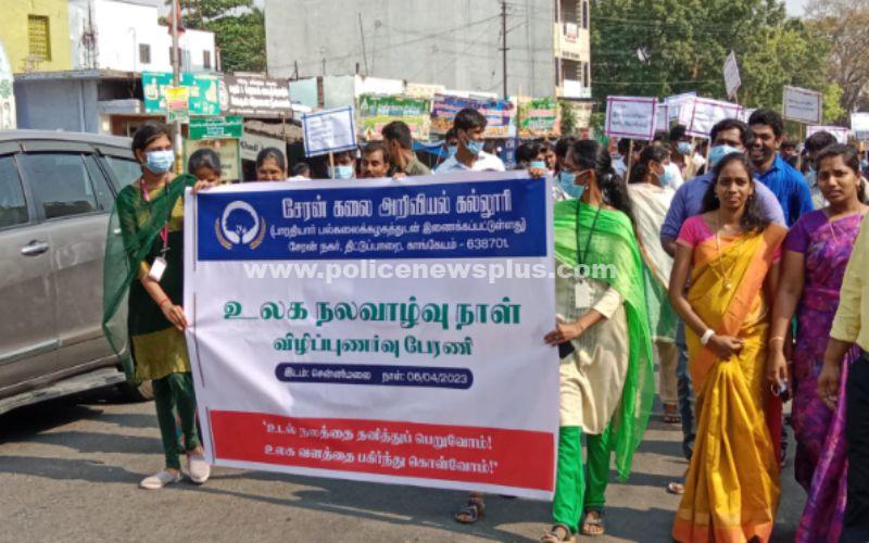ஈரோடு : ஈரோடு உலக நலவாழ்வு நாள் விழிப்புணர்வு பேரணி சென்னிமலையில் நடைபெற்றது இதில் திட்டுப்பாறை சேரன் கல்லுரி சார்பில் நடைபெற்ற விழிப்புணர்வு பேரணியில் கல்லுரி மாணவ மாணவியர்கள் பேராசிரியர்கள் மற்றும் பொதுமக்கள் கலந்து கொண்டனர்.
