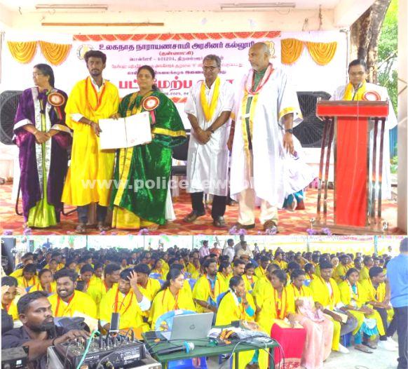 திருவள்ளூர்: திருவள்ளூர் மாவட்டம்,பொன்னேரி-திருவொற்றியூர் நெடுஞ்சாலையில் உலகநாத நாராயணசாமி அரசினர் கல்லூரி (தன்னாட்சி) உள்ளது.இக்கல்லூரி உள்ள திருவள்ளுவர் அரங்கில் நேற்று பட்டமேற்பு விழா நடைபெற்றது. நிகழ்ச்சியில் உலகநாத நாராயணசாமி அரசினர் கல்லூரி முதல்வர் முனைவர் ம.ச. தில்லைநாயகி அனைவரையும் வரவேற்று வரவேற்புரை நிகழ்த்தினார்.தேர்வு கட்டுப்பாட்டு அலுவலர் முனைவர் கா.சொர்ண முத்துராஜ் பட்டமேற்பு விழா அறிக்கையை வாசித்தார். சென்னை வியாசர்பாடி டாக்டர் அம்பேத்கர் அரசு கல்லூரி முதல்வர் முனைவர் க.சிவகுமாரி விழா பேருரை நிகழ்த்தினார். துறைத்தலைவர்கள் பட்டம் ஏற்பு மாணவர்களை அறிமுகம் செய்தனர். இதனையடுத்து நிகழ்ச்சியில் 959 மாணவ மாணவிகளுக்கு பட்டமளிப்பு விழா நடைபெற்றது. இதில் கல்லூரி பேராசிரியர்கள், அலுவலகப் பணியாளர்கள் மற்றும் பட்டம் பெற்ற மாணவ மாணவிகள் அவர்களது பெற்றோர்கள் உறவினர்கள் என பலர் கலந்து கொண்டனர்.
