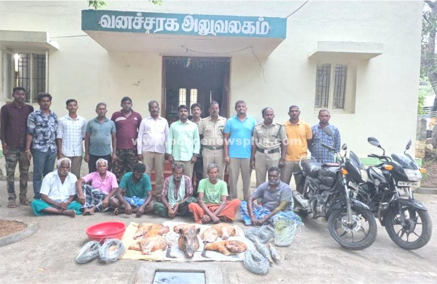 திண்டுக்கல் : திண்டுக்கல் மாவட்டம் ஒட்டன்சத்திரம் வன சரகம் சிந்தலவாடம்பட்டி கிராமம் ராமபட்டினம், புதூர் – மாட்டுப்பாதை தார் சாலையில் வனத்துறையினர் ரோந்து சென்றபோது மனோகரன் என்பவர் தோட்டத்தில் சுற்றி கட்டப்பட்ட கம்பியில் மின்சாரம் செலுத்தி காட்டு பன்றியை வேட்டையாடி கறியை பங்கு போட்டா சொக்கன்(47). முருகேசன்(60). பழனிச்சாமி(47). துரைசாமி(70). ராமசாமி(55). உள்ளிட்ட 6 பேரை வனத்துறையினர் கைது செய்து அவர்களிடமிருந்து வேட்டையாடிய காட்டுப்பன்றி கறியை பறிமுதல் செய்து வழக்கு பதிவு செய்து ரூ.2,40,000 அபராதம் விதித்தனர்.