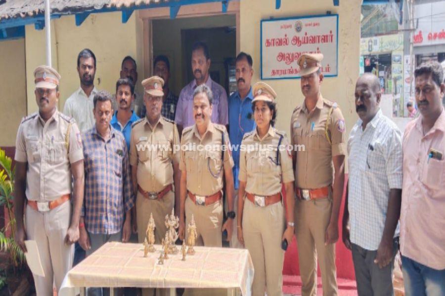 சேலம் : சேலம் மாவட்டம், ஓமலூர் உட்கோட்டம் தாரமங்கலம் காவல் நிலைய எல்லைப் பகுதியில் உள்ள வரதராஜ பெருமாள் கோவிலில் கடந்த (20/5/2023),ஆம் தேதி மாலை 3 மணி அளவில் இக்கோவிலின் பூசாரி குமரவேல் என்பவர் பூஜை செய்து கோவிலை பூட்டிவிட்டு சென்று விட்டதாகவும் மீண்டும் (21/5/2023) காலை 6:30 மணி அளவில் பூஜை செய்ய வந்து பார்த்தபோது கோவிலில் பூட்டு உடைக்கப்பட்டு கோவில் மடத்திலிருந்த உலோகத்தால் செய்யப்பட்ட பெருமாள் சிலை -1 , பூ தேவி சிலைகள் – 2, ஆஞ்சநேயர் சிலை – 1மற்றும் குழந்தை கிருஷ்ணர் சிலை – 1 என மொத்தம் ஏழு சிலைகள் காணவில்லை என தெரிய வந்ததால் இக்கோவிலின் தர்மகத்தா தாரமங்கலத்தை சேர்ந்த அருணாச்சலம் மகன் இனியன் என்பவர் கொடுத்த புகாரின் பேரில் தாரமங்கலம் காவல் வழக்கு பதிவு செய்யப்பட்டது. பிறகு சேலம் மாவட்ட காவல் கண்காணிப்பாளர் திரு.சிவகுமார், அவர்களின் உத்தரவின் படி இரண்டு தனிப்படைகள் அமைத்து CCTV கேமரா பதிவுகளை ஆய்வு செய்ததில் பெரிய சோரகை குள்ளநூரை சேர்ந்த சின்னத்தம்பி மகன் சக்திவேல் என்பவர் திருடி சென்றதாக தெரிய வந்ததால் இவ்வழக்கில் சம்பந்தப்பட்ட குற்றவாளியை கைது செய்து களவு போன பொருட்கள் குற்றவாளி இடமிருந்து கண்டுபிடித்த தனிப்படை காவலர்களை சேலம் மாவட்ட காவல் கண்காணிப்பாளர் திரு.சிவகுமார் அவர்கள் வெகுவாக பாராட்டினார்.