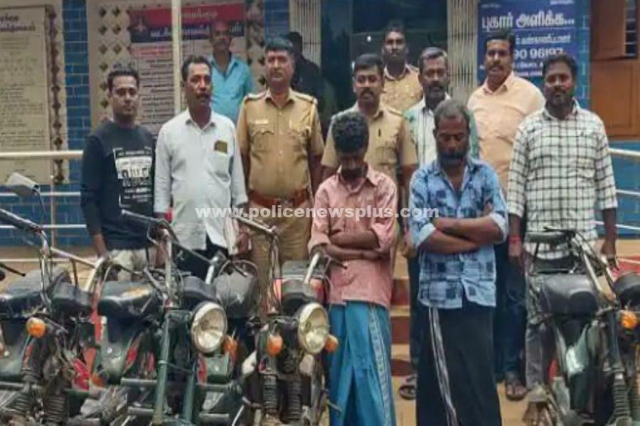 சிவகங்கை : சிவகங்கை மாவட்டம், காரைக்குடியில் உள்ள கழனிவாசல் வாரச்சந்தையில் தொடர் பைக் திருட்டு நடந்து வந்தது. இது குறித்து எழுந்த, தொடர் புகாரின் பேரில் உதவி காவல் கண்காணிப்பாளர் உயர்திரு டாக்டர் ஆர். ஸ்டாலின் IPS உத்தரவின் பேரில் காரைக்குடி வடக்கு காவல் நிலைய ஆய்வாளர் சி. ராஜகுமார், அவர்கள் முன்னிலையில் காரைக்குடி உட்கோட்ட குற்றப்பிரிவு சார்பு ஆய்வாளர் மரியாதைக்குரிய திரு. உதயகுமார் அவர்கள் மற்றும் காரைக்குடி வடக்கு காவல் நிலைய சார்பு ஆய்வாளர் வி. இளையராஜா அவர்கள் தலைமையில் மற்றும் காரைக்குடி வடக்கு காவல் நிலைய சிறப்பு சார்பாய்வாளர் திரு.எம் ரமேஷ், அவர்கள் மற்றும் ஏனைய காவலர்கள் விசாரணை நடத்தி வந்தனர். விசாரணையில், பைக் திருட்டில் ஈடுபட்டது. நெசவாளர் காலனி கந்தசாமி மகன் ரவிச்சந்திரன் (49), ஓ. சிறுவயல் ராஜீவ்காந்தி நகர் காந்திராஜா மகன் ராஜா (42) என்பது தெரிய வந்தது. மேலும் இவர்களுக்கு கியர் வண்டி ஓட்ட தெரியாததால், கியர் இல்லாத பைக்குகளை திருடியுள்ளனர். இருவரையும் கைது செய்த போலீசார் அவர்களிடம் இருந்து 9 பைக்குகளை பறிமுதல் செய்தனர்.