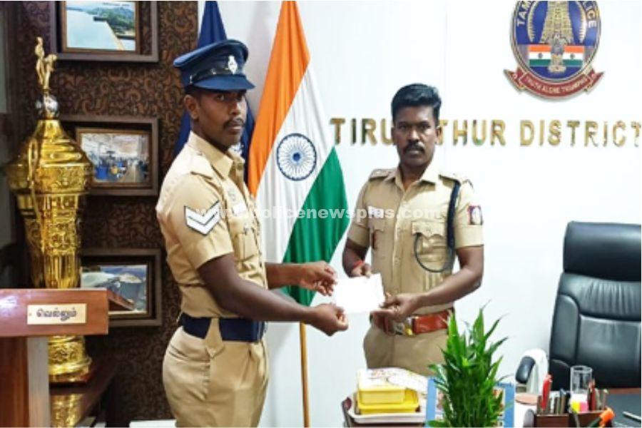 திருப்பத்தூர் : திருப்பத்தூர் மாவட்டம் இரவு ரோந்து பணியின் போது துரிதமாக செயல்பட்டு, TN 23 BW 6477 போர்ட் காரில் சட்டவிரோதமாக கடத்தி வரப்பட்ட சுமார் ரூபாய் 88,500/- மதிப்புள்ள 30 பெட்டிகள் கொண்ட 2880 கர்நாடக மாநில மது பாக்கெட்டுகளை காருடன் பறிமுதல் செய்து ஜோலார்பேட்டை காவல் நிலையத்தில் வழக்குப்பதிவு செய்யப்பட்டுள்ளது. இத்தகைய சிறப்பான செயல் செய்த முதல் நிலை காவலர்-541 திரு.பிரபாகரன் அவர்களை மாவட்ட காவல் கண்காணிப்பாளர் டாக்டர் .K.S.பாலகிருஷ்ணன்.,BVSc, அவர்கள் நேரில் அழைத்து வெகுமதி வழங்கி பாராட்டி, மேலும் பணியை சிறப்பாக செய்ய அறிவுரைகள் வழங்கி ஊக்குவித்தார்.