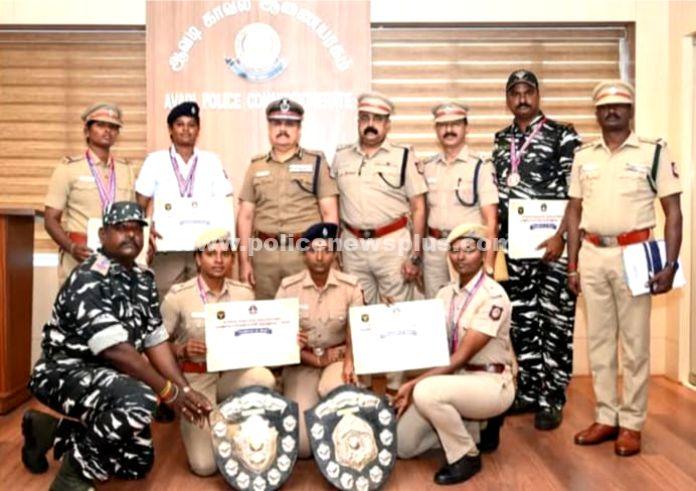 திருவள்ளூர்: ஆவடி காவல் ஆணையாளர் திரு.கி.சங்கர் இ.கா.ப அவர்கள் தமிழ்நாடு காவல்துறையின் மாநில அளவிலான துப்பாக்கி சுடுதல் போட்டியில் இணையதள குற்றப்பிரிவு காவல் ஆய்வாளர் திரு. B.பிரவீன்குமார் வெள்ளி – 1 வெண்கலம் -1 T 11 காவல் உதவி ஆய்வாளர் திருமதி.சுதா தங்கம் -2 வெள்ளி -1 வெண்கலம்-1 T 6 பெண் காவலர் திருமதி. நந்தினி தங்கம் -1 வெள்ளி -1 ஆவடி ஆயுதப்படை பெண் காவலர்கள் திருமதி. கோகிலா தேவி வெள்ளி -1 செல்வி. செல்வராணி வெண்கலம் 1 என 10 பதக்கங்கள் மற்றும் கோப்பைகள் வென்றவர்களை நேரில் அழைத்து வாழ்த்துக்களை தெரிவித்து வெகுவாக பாராட்டினார்கள்.