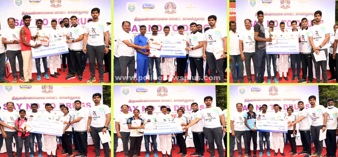 திருவண்ணாமலை: திருவண்ணாமலையில்19.03.2022-ந் தேதி காலை 06.00 மணிக்கு மாவட்ட காவல்துறையின் சார்பில் “SAY NO TO DRUGS” விழிப்புணர்வு மினி மாரத்தான் போட்டி நடத்தப்பட்டது. இதில் ஆண்களுக்கான போட்டியில் T.ரவிக்குமார் செங்கம் முதலிடத்தையும், D.சக்திவேல் இரண்டாம் இடத்தையும், R.ராஜா மூன்றாம் இடத்தையும் பிடித்தனர். பெண்களுக்கான போட்டியில் R.அபிராமி VDS ஜெயின் பள்ளி திருவண்ணாமலை முதலிடத்தையும், நிபியா ஜோசப் இரண்டாம் இடத்தையும், P.ரூபிகா திருவண்ணாமலை மூன்றாம் இடத்தையும் வென்றனர்.