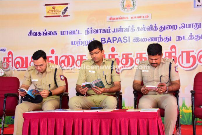 சிவகங்கை : சிவகங்கை மாவட்ட நிர்வாகம், பள்ளி கல்வித்துறை, பொது நூலக இயக்கம் மற்றும் BAPASI இணைந்து நடத்தும் சிவகங்கை புத்தகத் திருவிழா 2024 சிவகங்கையில் நடைபெற்று வருகிறது. (31.01.2024)ம் தேதி காவல்துறை சார்பாக புத்தகத் திருவிழாவில் சிவகங்கை மாவட்ட காவல் கண்காணிப்பாளர் உயர் திரு.பா.க.அரவிந்த், இ.கா.ப., அவர்கள், பயிற்சி உதவி காவல் கண்காணிப்பாளர் திரு.ஆகாஷ் ஜோசி இ.கா.ப அவர்கள், சிவகங்கை உட்கோட்ட காவல் துணைக் கண்காணிப்பாளர் திரு.சிபிசாய் சௌந்தர்யன் அவர்கள், மற்றும் காவல்துறையினர் கலந்து கொண்டனர். இந்நிகழ்ச்சியில் சிவகங்கை உட்கோட்ட காவல் துணைக்கண்காணிப்பாளர் திரு.சிபிசாய் சௌந்தர்யன் அவர்கள் வரவேற்புரை நிகழ்த்தி வாசித்தலின் முக்கியத்துவம் பற்றி பேசினார். சிறப்புரையாற்றிய காவல் கண்காணிப்பாளர் அவர்கள் பள்ளி மாணவர்கள் மற்றும் காவல்துறையினருக்கு வாசித்தலின் முக்கியத்துவம் பற்றி பேசினார். இந்நிகழ்ச்சியில் பள்ளி மாணவர்கள் மற்றும் காவலர்கள் கலந்து கொண்டனர்.