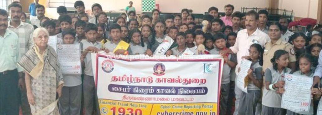 திருவண்ணாமலை: திருவண்ணாமலை மாவட்ட காவல் கண்காணிப்பாளர் அவர்களின் அறிவுறுத்தலின்படி, தி.மலை மாவட்ட சைபர் கிரைம் பிரிவு கூடுதல் காவல் கண்காணிப்பாளர் திரு.M.பழனி அவர்கள் மேற்பார்வையில், திருவண்ணாமலை மாவட்டம் சோமாசிபாடியில் உள்ள அண்ணாமலை மெட்ரிகுலேஷன் மேல்நிலைப் பள்ளியில் மாவட்ட சைபர் கிரைம் பிரிவு காவல்துறை சார்பில் இணையவழி குற்றம் குறித்துவிழிப்புணர்வு மாணவ, மாணவிகளுக்கிடையே ஏற்படுத்தப்பட்டு துண்டு பிரசுரங்களும் வழங்கப்பட்டது.