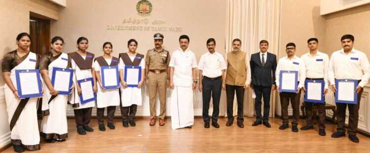 சென்னை : காவல்துறை சார்பில் பணிக்காலத்தில் காலமான காவலர்களின் வாரிசுதாரர்கள் 912 பேருக்கு கருணை அடிப்படையில் தகவல் பதிவு உதவியாளர்,காவல் நிலைய வரவேற்பாளர் பணியிடங்களுக்கு பணிநியமன ஆணைகளை வழங்கிடும் அடையாளமாக 8 நபர்களுக்கு பணிநியமன ஆணைகளை மாண்புமிகு முதலமைச்சர் திரு. மு.க ஸ்டாலின், அவர்கள் வழங்கினார்.