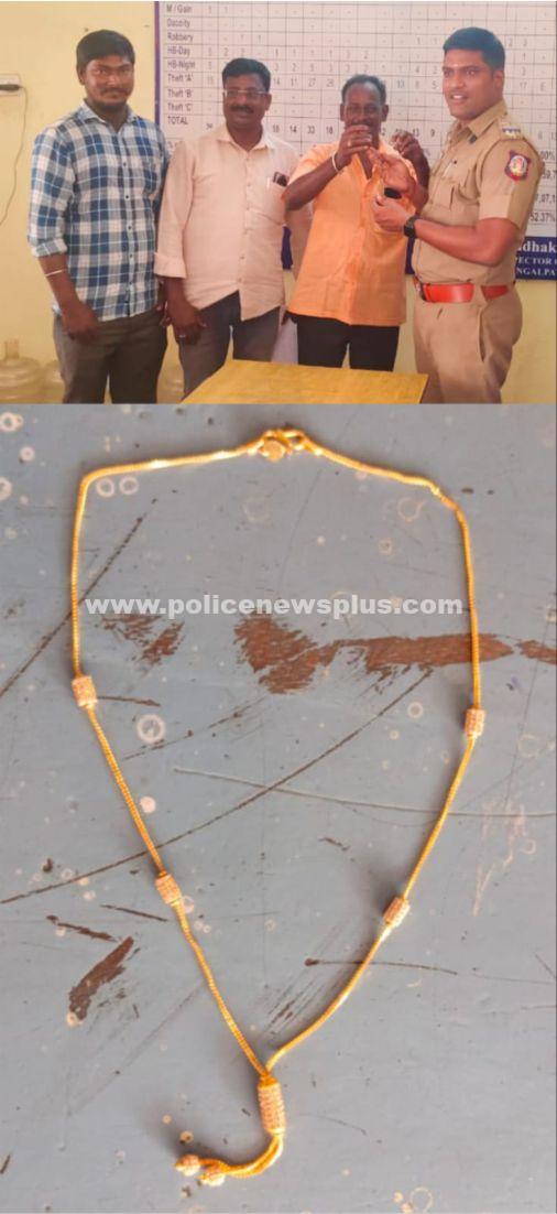 செங்கல்பட்டு: செங்கல்பட்டு நகர காவல் நிலையத்தில் காவல் ஆய்வாளர். ஹரிகரன்.காவல் உதவி ஆய்வாளர் மணிகண்டன் அவர்களிடம் செங்கல்பட்டு wwc யின் பொருளாளர் lion வேலாயுதம் அவர்கள் ஸ்டேட் பேங்க் நுழைவு வாயில் அருகில் கேட்பாரற்று கிடந்த 1சவரத்துக்கு மேல் உள்ள தங்க சங்கிலியை மாலை 2.மணியளவில் காவல் துறையிடம் ஒப்படைத்தார். அவருக்கு Wwc நண்பர்கள் சார்பாக வாழ்த்துக்களை தெரிவித்தனர். மற்றும் lion தென்றல் சங்கர் உடன் இருந்தனர். மற்றும் நகர காவல் ஆய்வாளர் ஹரிகரன் அவர்கள் சிறந்த சேவைக்கு பாராட்டுக்கள் தெரிவித்தார்.