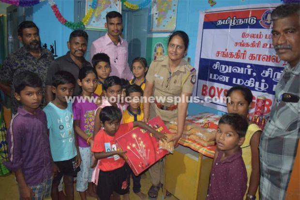 சேலம் : சேலம் மாவட்டம் சங்ககிரி காவல் துறை சார்பில் சிறுவர் சிறுமியர் மன மகிழ் மன்றத்தில் சங்ககிரி காவல் ஆய்வாளர் தேவி அவர்கள் தீபாவளி பண்டிகையொட்டி முன்னிட்டு சிறுவர் சிறுமிகளுக்கு பட்டாசு இனிப்பு வழங்கினார். இந்நிகழ்வில் கொங்காணபுரம் காவல் உதவி ஆய்வாளர் மற்றும் சுரேஷ், நிர்வாகிகள் கலந்து கொண்டனர்.