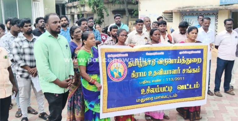 இதன் ஒரு பகுதியாக, மதுரை மாவட்டம், உசிலம்பட்டி வட்டாச்சியர் அலுவலகம் முன்பு கிராம உதவியாளர்களின் 5 அம்ச கோரிக்கைகளை வலியுறுத்தி உசிலம்பட்டி வட்டார கிராம உதவியாளர்கள் இணைந்து கண்டன ஆர்ப்பாட்டத்தில் ஈடுபட்டனர். இந்த ஆர்ப்பாட்டத்தில், கிராம நிர்வாக அலுவலர்கள், அலுவலக உதவியாளர்கள் உள்ளிட்ட வருவாய்த்துறை அலுவலர்களும் கிராம உதவியாளர்களுக்கு ஆதரவாக பங்கேற்று, பழைய பென்சன் திட்டத்தை அமல் படுத்த கோரிக்கை உள்ளிட்ட பல்வேறு தேர்தல் வாக்குறுதியை நிறைவேற்ற வலியுறுத்தி