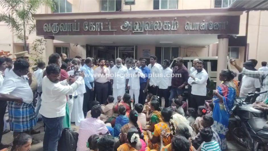 திருவள்ளூர்: திருவள்ளூர் மாவட்டம் பொன்னேரி அடுத்த பூங்குளம் ஊராட்சிக்கு உட்பட்ட ரெட்டிப்பாளையம் கிராமத்தில் 100க்கும் மேற்பட்ட குடும்பங்களை சேர்ந்த ஆதிதிராவிடர் மற்றும் பழங்குடியின மக்கள் வசித்து வருகின்றனர். இதே ஊராட்சியில் மங்கோடு கிராமத்தில் மீனவ மக்கள் வசித்து வருகின்றனர். ரெட்டிப்பாளையம் கிராமத்தில் அமைந்துள்ள அரசு புறம்போக்கு நிலத்தில் மீனவ கிராம மக்கள் வீட்டுமனை பட்டா வழங்கப்பட உள்ளதாக கூறப்படுகிறது. இதற்க்கு எதிர்ப்பு தெரிவித்து ரெட்டிப்பாளையம் கிராம மக்கள் பொன்னேரி கோட்டாட்சியர் அலுவலகத்தை முற்றுகையிட்டு போராட்டத்தில் ஈடுபட்டனர். தங்களது கிராமத்தில் வேறு கிராமத்தை குடியமர்த்த கூடாது என எதிர்ப்பு தெரிவித்தனர். தங்களது கிராமத்தில் உள்ள மக்களுக்கு இலவச வீட்டுமனை பட்டா வழங்கிட வேண்டும் என பல ஆண்டுகளாக கோரிக்கை வைத்து வரும் நிலையில் வேறு கிராம மக்களை தங்களது கிராமத்தில் குடியமர்த்தி பட்டா வழங்குவதை ஏற்க முடியாது என தெரிவித்தனர்.