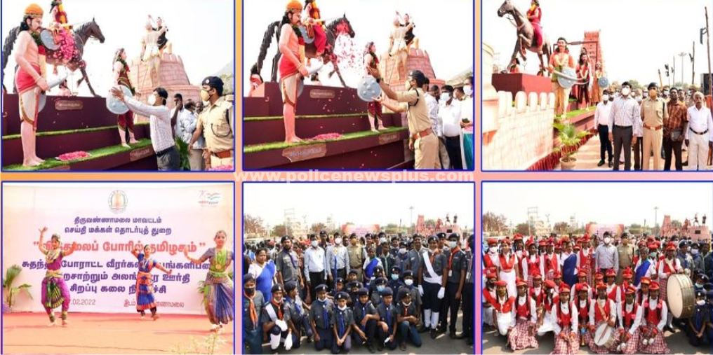 திருவண்ணாமலை: திருவண்ணாமலை மாவட்டத்திற்கு வந்தடைந்த, தமிழக அரசின் சென்னை குடியரசு தின விழாவில் பங்கேற்ற இந்திய சுதந்திரப் போரில் பங்கேற்ற தமிழக சுதந்திர போராட்ட வீரர்களை போற்றும் வகையிலான அலங்கார ஊர்தியை திருவண்ணாமலை மாவட்ட ஆட்சியர் திரு.பாமுருகேஷ்,இ.ஆ.ப., அவர்கள் மற்றும் திருவண்ணாமலை மாவட்ட காவல் கண்காணிப்பாளர் திரு.அ.பவன்குமார்,இ.கா.ப., அவர்கள் மலர் தூவி வரவேற்றனர்.
